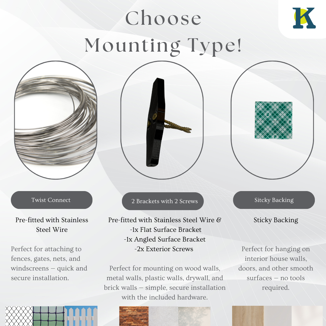 Your order will include one of three mounting options: Twist Connect (pre-fitted with stainless steel wire), a bracket with 2 screws, or a sticky backing — depending on your selection. No additional tools or equipment needed.